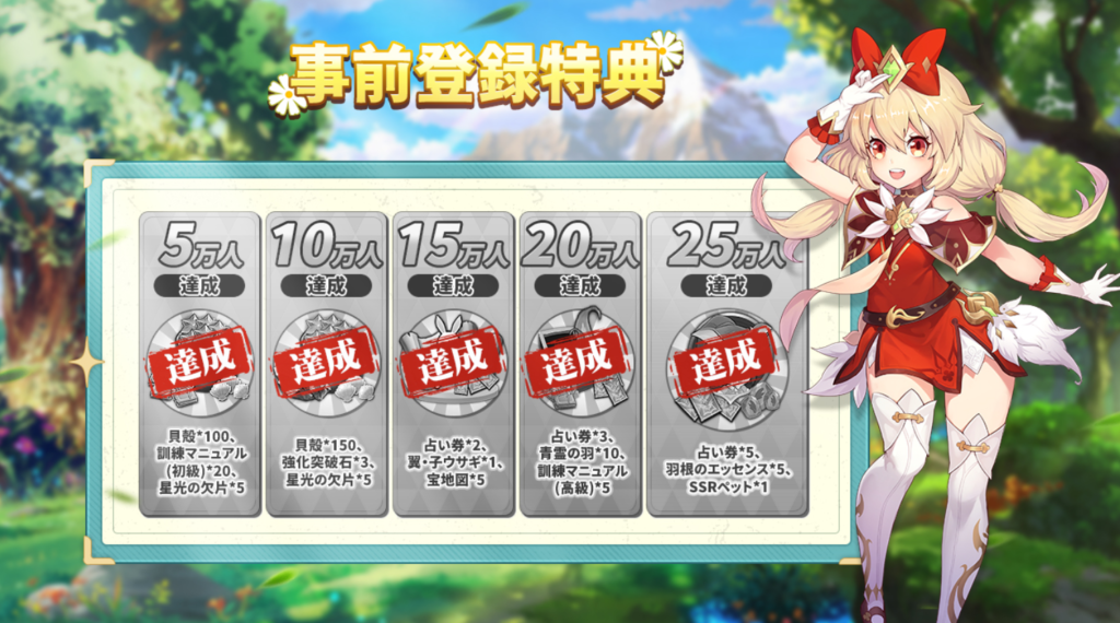 事前登録者数は25万人達成しているので、事前登録をしていた方は、以下のアイテムを全員受け取れます。